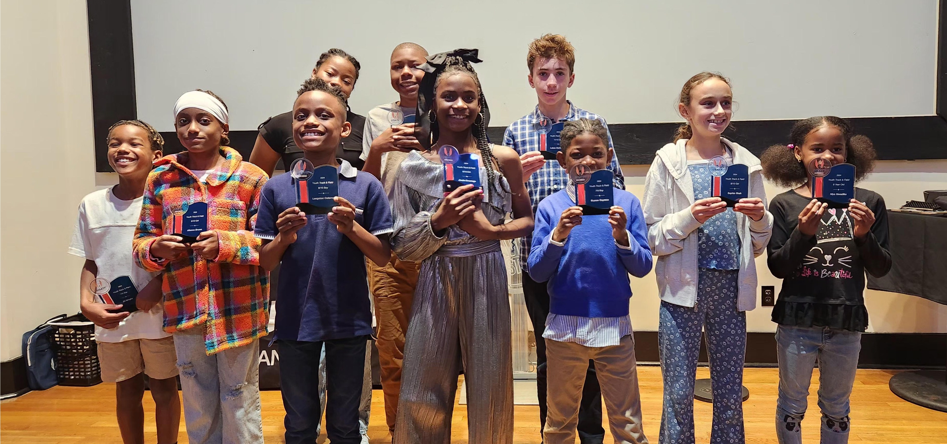 Youth competitors (Track & FIeld and Cross Country) for the 2023 season were honored at the Association Awards Luncheon on January 28, 2024. Awardees were Roland Quinn, Paris Hollins, Avery Robinson, Nicolas Worrall, Lucas Derheimer, Kingston Paul Khoury, Khalifa Price, Aleksandra Strem, Kareli Rascon, Lindsey Billotte, Dillan Durruthy-Faulkner, Braden Pegg, Jasir Fontenot, Tyler Hedstrom, and Isabel Gladden.